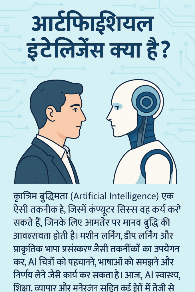 आज के डिजिटल युग में “आर्टिफ़िशियल इंटेलिजेंस” (AI) या कृत्रिम बुद्धिमत्ता (AI) सबसे चर्चित विषयों में से एक बन गया है। यह तकनीक न केवल कंप्यूटर सिस्टम को समझदार बना रही है बल्कि हमारे जीवन के हर क्षेत्र — स्वास्थ्य, शिक्षा, व्यवसाय और मनोरंजन — को तेज़ी से बदल रही है।